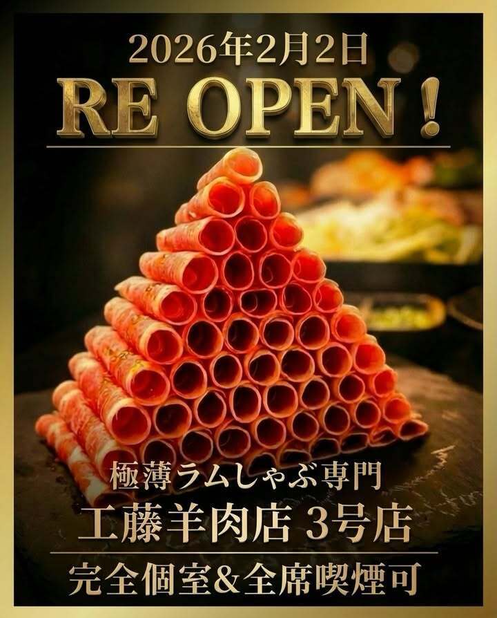 2026年2月2日より、極薄ラムしゃぶ専門「工藤羊肉店 3号店」がリニューアルオープンします!🍺😊